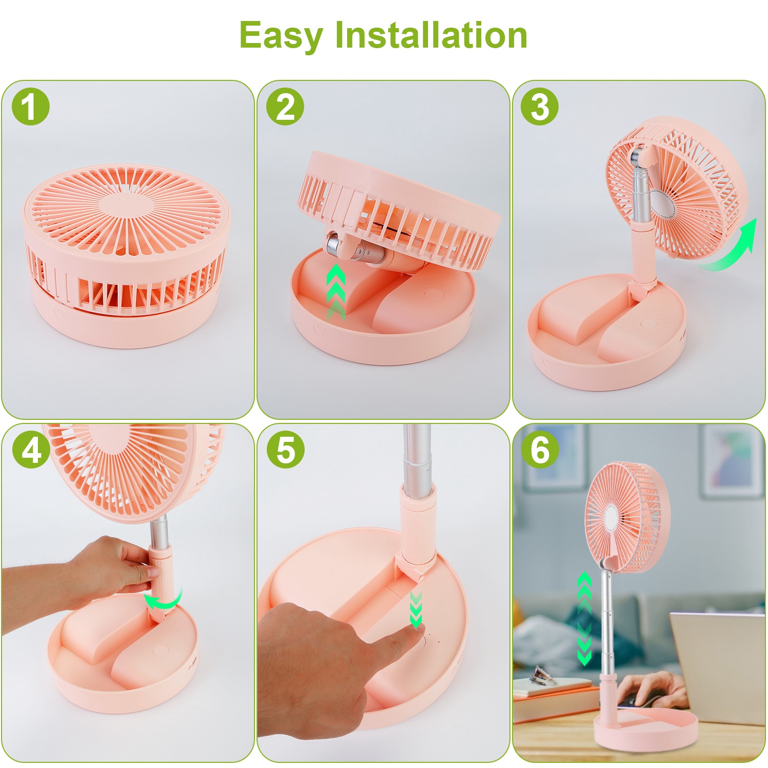 *Portable & Easy Storage*:No assembly is required. Standing and desk fan is easy to fold up for convenient storage. You can bring this fan to any place you want for outdoor using,take it to camping,summer fireworks festivals,watching sports,and anywhere need cool wind.