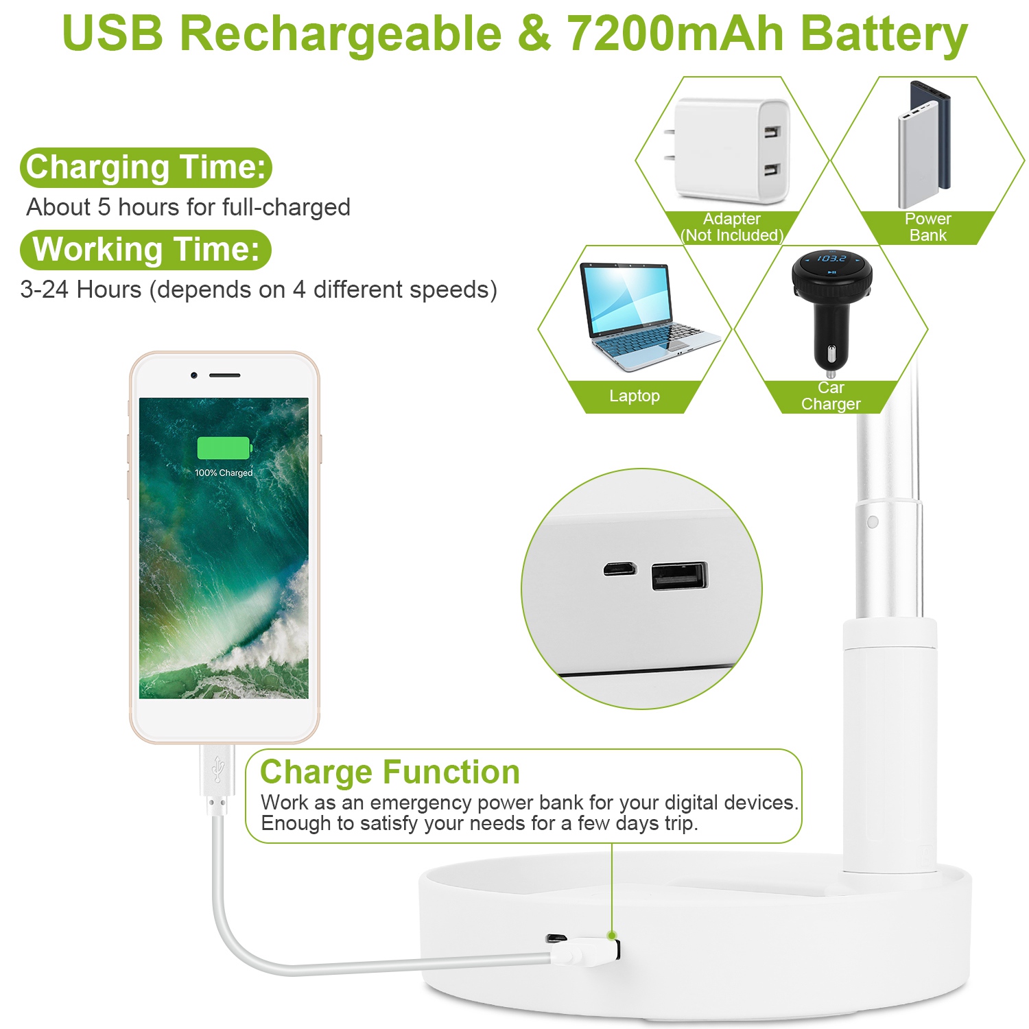 *24Hrs All Day Standby & USB Charging*:Built-in 7200mAh large rechargeable battery allows for about 5 hours for full-charged,ensuring working 3-24 hours(working time depends on 4 different speeds). Come with USB output port,can be work as an emergency power bank for your digital devices. Enough to satisfy your needs for a few days trip.