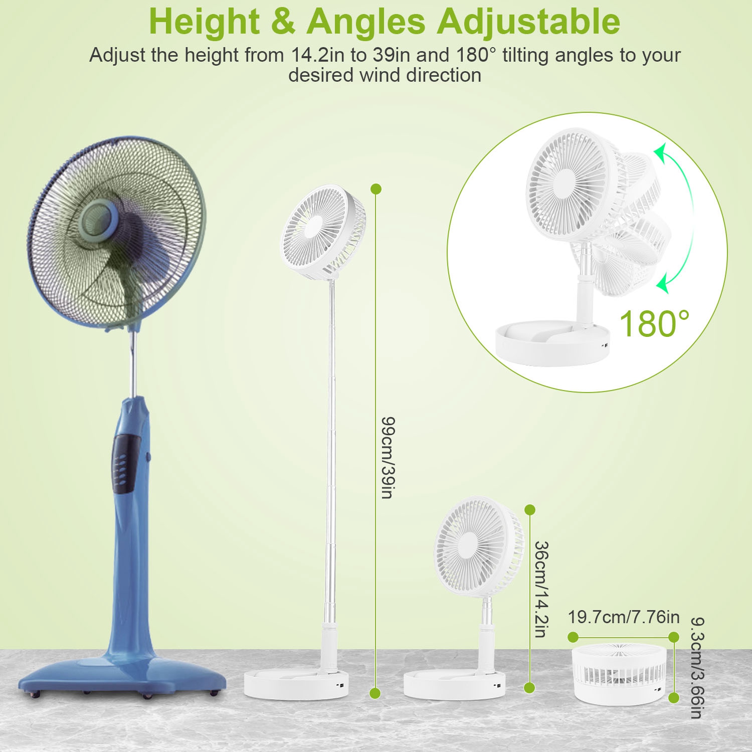 *Height & Angles Adjustable*:With adjustable height from 14.2in to 39in and with 180° tilting angle,just adjust the fan head to your desired wind direction and adjust the height to be as a desk fan or floor fan for your personal need.