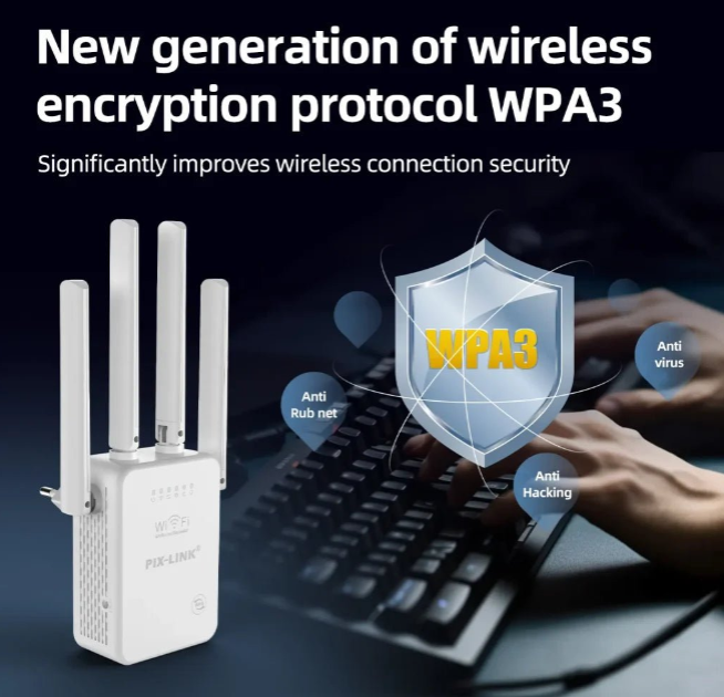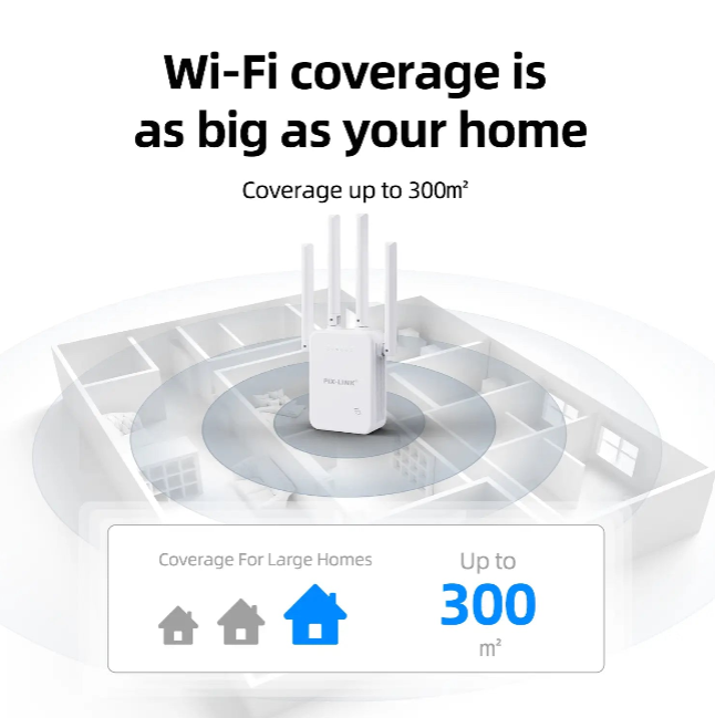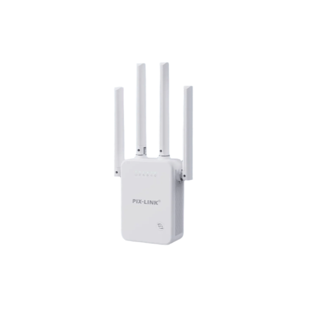 The PIX-LINK Wi-Fi Range Extender boosts your wireless network coverage and eliminates dead zones in your home or office. With four high-gain antennas and up to 300Mbps speed, it ensures a stable, high-speed connection across multiple devices. Designed for easy plug-and-play setup, this extender is perfect for streaming, gaming, and working from anywhere in your space.