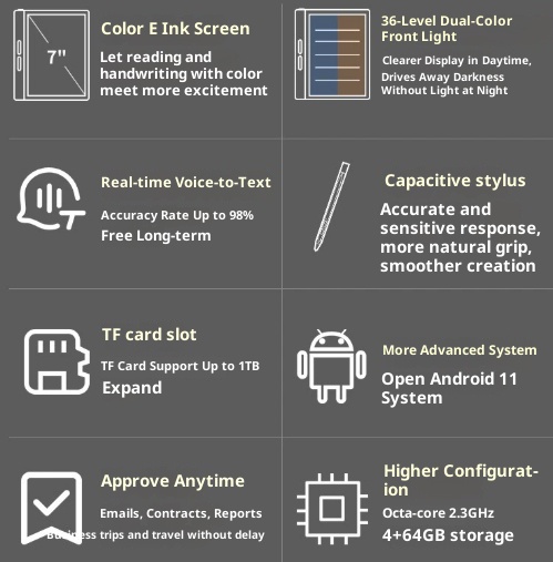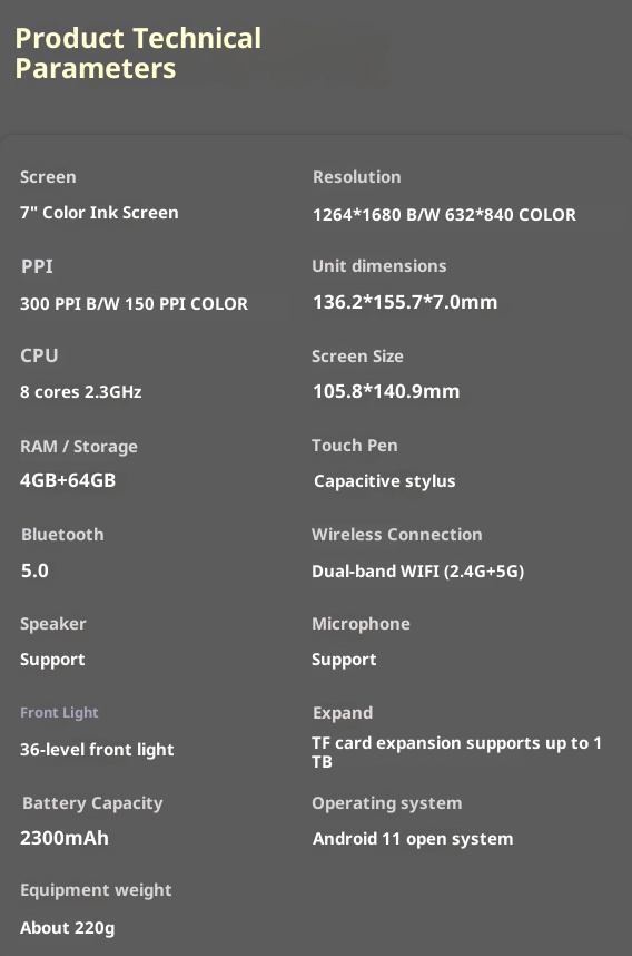 Specification: 7-inch Color E-ink Smart Office E-book Reader