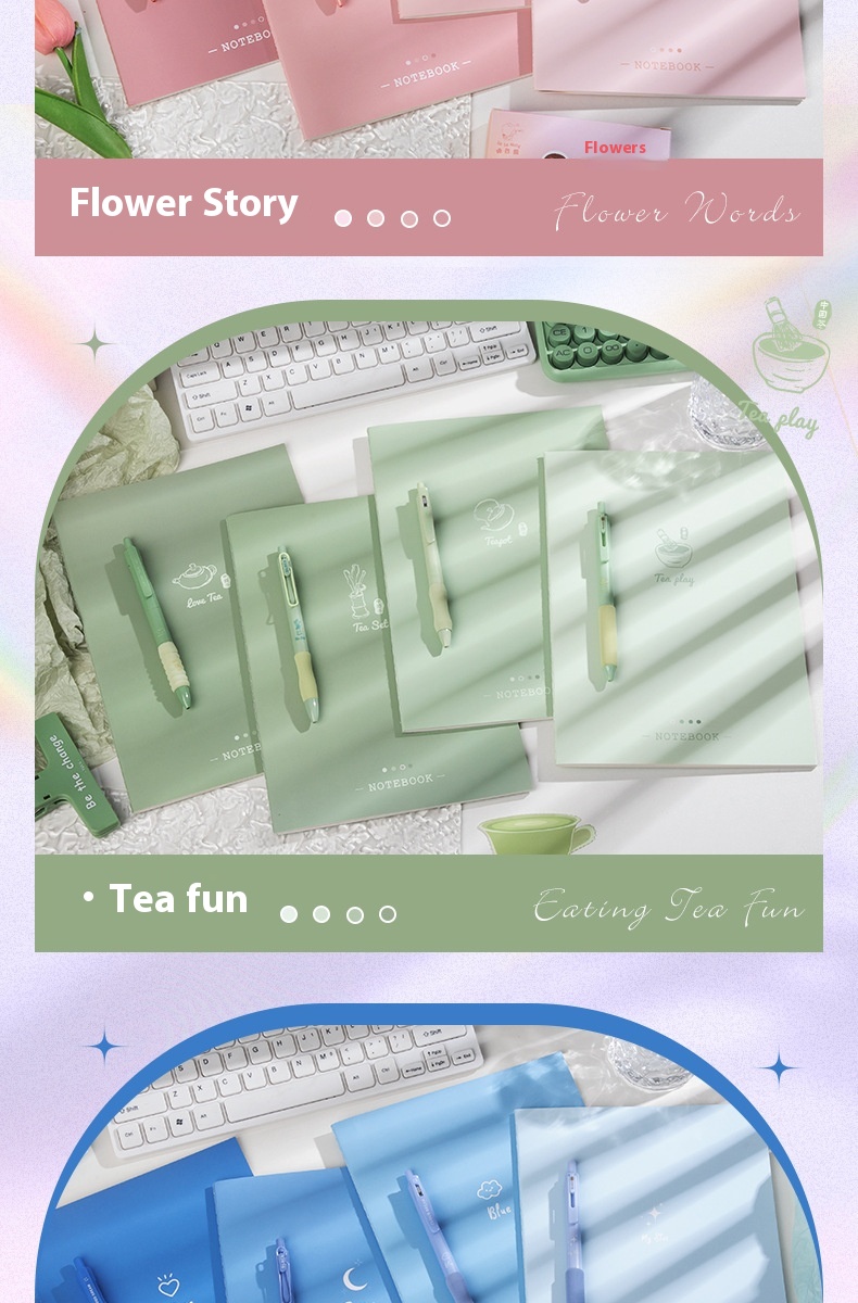 Cover: Dream on the cloud (4 pieces), tea fun (4 pieces), cheese grape (4 pieces), flower words (4 pieces),4 colors mixed (4 pieces), dream on the cloud (4 pieces) pen set, cheese grape (4 pieces) pen set, flower words (4 pieces) pen set, tea fun (4 packs) pen set,