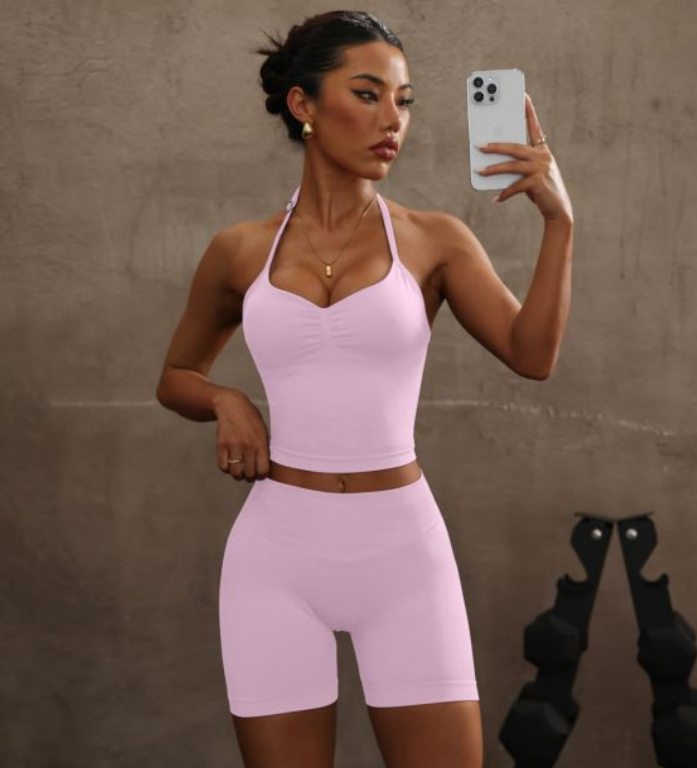 Halter Spaghetti Straps Exercise Vest High Waist Crimp Shorts Suit