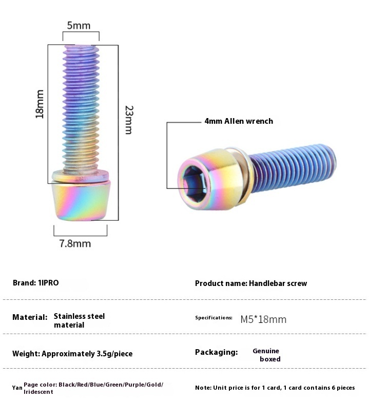 Color: handle screws black one card/6 pieces, handle screws red one card/6 pieces, handle screws blue one card/6 pieces, handle screws green one card/6 pieces, handle screws purple one card/6 pieces, handle screws Golden one card/6 pieces, handle screws colorful one card/6 pieces