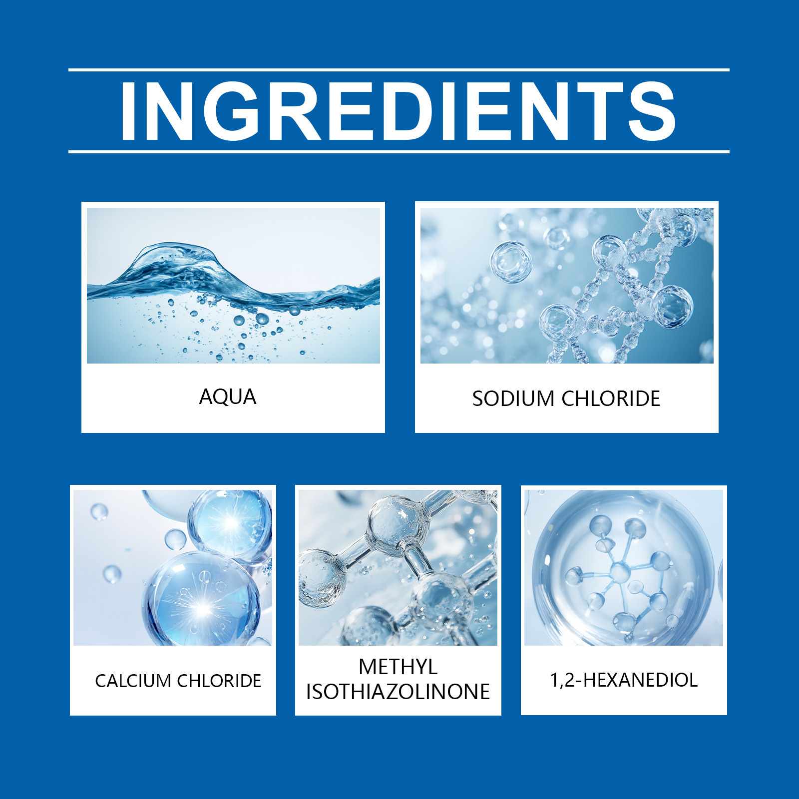 Ingredients :Water, Sodium Chloride, Calcium Chloride, 1,2-hexanediol, Methyl Isothiazolinone
