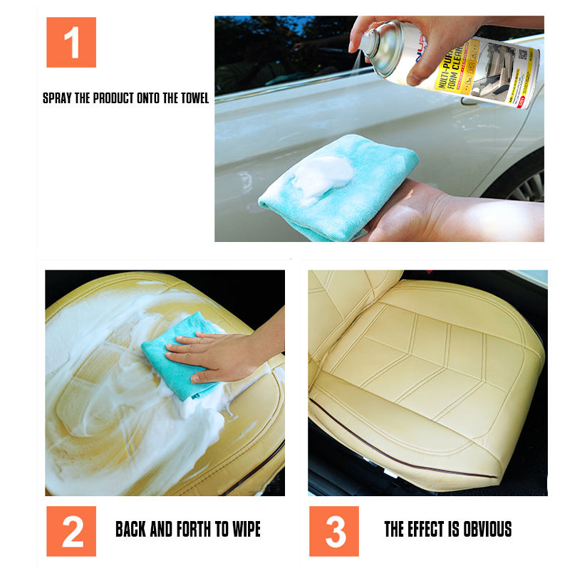 1: Shake evenly before use, spray on the stain surface mobile, and scrub with sponge in time; Heavy stain areas can be gently rubbed with a soft brush.