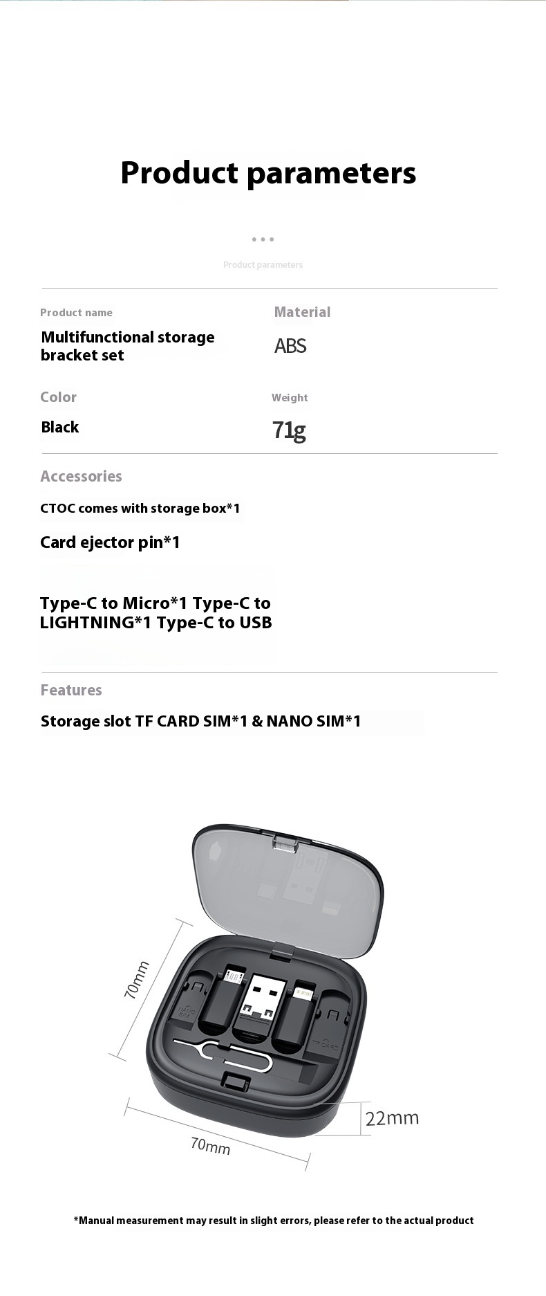 Storage box set*1pc(Storage Box*1pc,SUB*1pc,Lightning*1pc,Micro Android*1pc,Card Removal Pin*1pc)