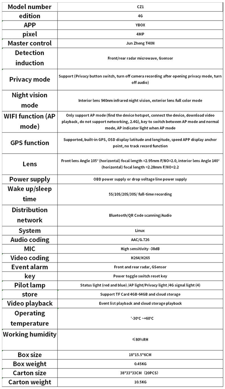Specifications: CZ1-4G Southeast Asia edition, CZ1-4G European edition