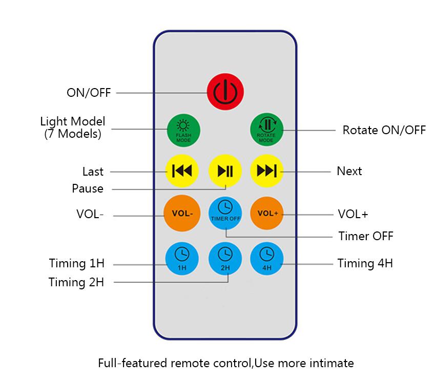 6. Smart Touch Key: The power button is the key to switch the machine on and off and the light to switch on. Press and hold the key for 3 seconds to start. Tap to select one of seven lighting modes. Press and hold the key for 3 seconds to shut down. + And buttons are volume buttons. The projector has built-in hypnotic music. The volume is low after power on, and the user can press + to skip to the next song. This function is only available when TF card is inserted
