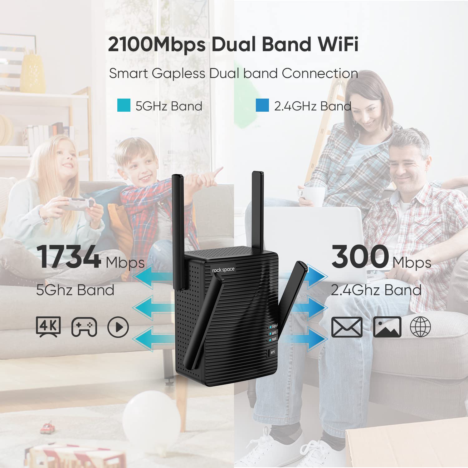 xtend Wifi Coverage on Dual-band. Boost internet WiFi signal to wider coverage up to 1292 sq.ft,optimize WiFi network transmission. AC2100 Wifi Extender helps you reduce the data transmission time and minimize the lag. This rockspace dual band wifi range extender also provides up to 300 Mbps for 2.4 GHz and 1734 Mbps performance on 5 GHz band. Wifi range extender – no more WiFi dead zones at home